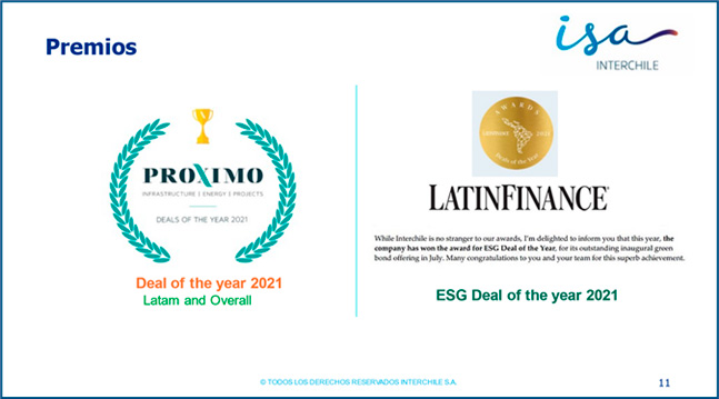 En tanto, el gerente de Finanzas de la compañía Aquiles Vargas, explicó que “es un honor ser premiados por esta prestigiosa revista financiera. La emisión de este bono proyecto verde es un hito histórico para ISA Interchile debido a tres aspectos fundamentales: su certificación ESG, que es de suma importancia en el actual contexto de Cambio Climático, su magnitud al superar el billón de dólares y su alto rating otorgado por las principales agencias calificadoras”.
